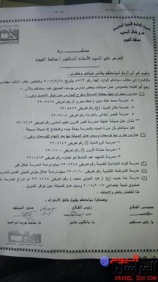 افاد المهندس محمد فريد ابراهيم مدير هيئة الابنية التعليمية بالفيوم بانه جارى التوسعات بالعديد من المدارس التابعة لادارة يوسف الصديق التعليمية وسيتم عمل الصيانه بها عقب الانتهاء من التوسعات وهى مدرسة الرواشدية ومدرسة منشأة قارون ومدرسة الشهيد عبدالباسط ابونضارة ومدرسة قوته الابتدائية القديمة وسيتم دراسة ادراج المدرسة احلال كلى ، ومدرسة الشواشنة الثانوية وسيتم دراسة احلال جزئى للمبنى القديم بالمدرسة ومدرسة حنا حبيب الاعدادية (عبدالمولى محمد) وتم ادراج المدرسة خطة صندوق التنمية الاجتماعى لعام 2017/2018 وسيتم عمل الصيانة عقب توافر التمويل