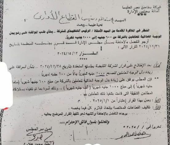زياده بدل الوجبه للعاملين بمطاحن مصرالعليا