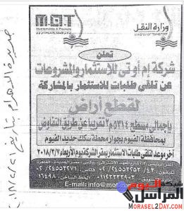 وفي تاريخ 21/2/2018قامت شركة “أم أو تي”، للاستثمار والمشروعات التابعة لوزارة النقل بنشر اعلان عن بيع نحو 5314متر من أرض تابعة للسكة الحديد في الفيوم عن طريق التفاوض، دون تحديد موعد البيع، أو مكان البيع، أو سعر المتر في هذه المساحة، في مخالفة صريحة وواضحة للقانون، حيث أن هذه الأرض هي عبارة عن حق انتفاع وجزء من المساحة الإجمالية والكلية للأرض المقامة عليها المحطة الرئيسية وخط السكة الحديد في قلب مدينة الفيوم، ولا يجوز لوزارة النقل التصرف فيها بالبيع أو الإيجار، لأن الغرض منها هو للسكة الحديد فقط، وأن أي نشاط يخالف هذا الغرض تعود الأرض لورثة محرر عقد حق الانتفاع مع الدولة.